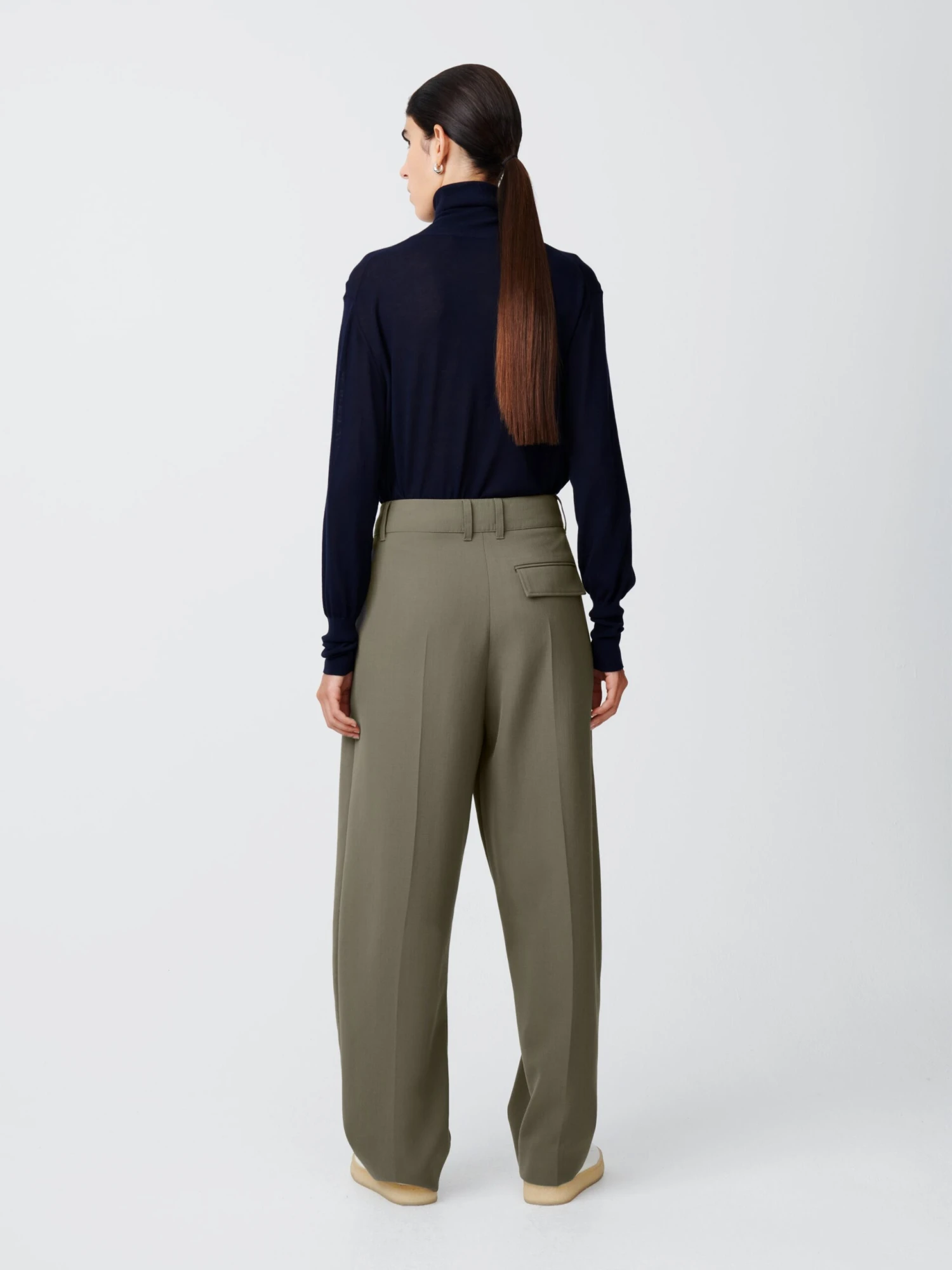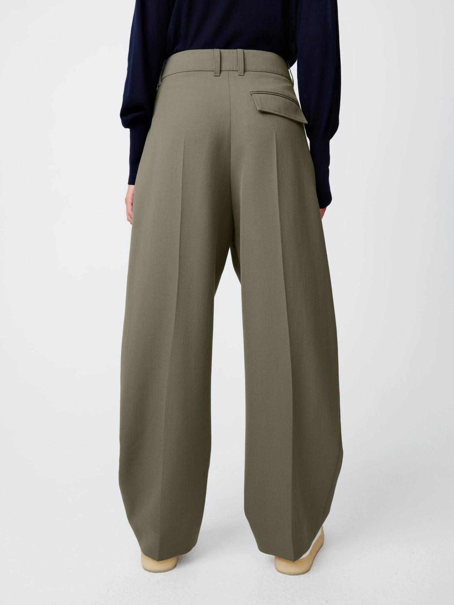 The Acuna pants combine a high rise with a wide, flowing leg. Double pleats add further volume around the hips, while a slightly elongated length allows the fluid tech wool fabric to fold and pool.