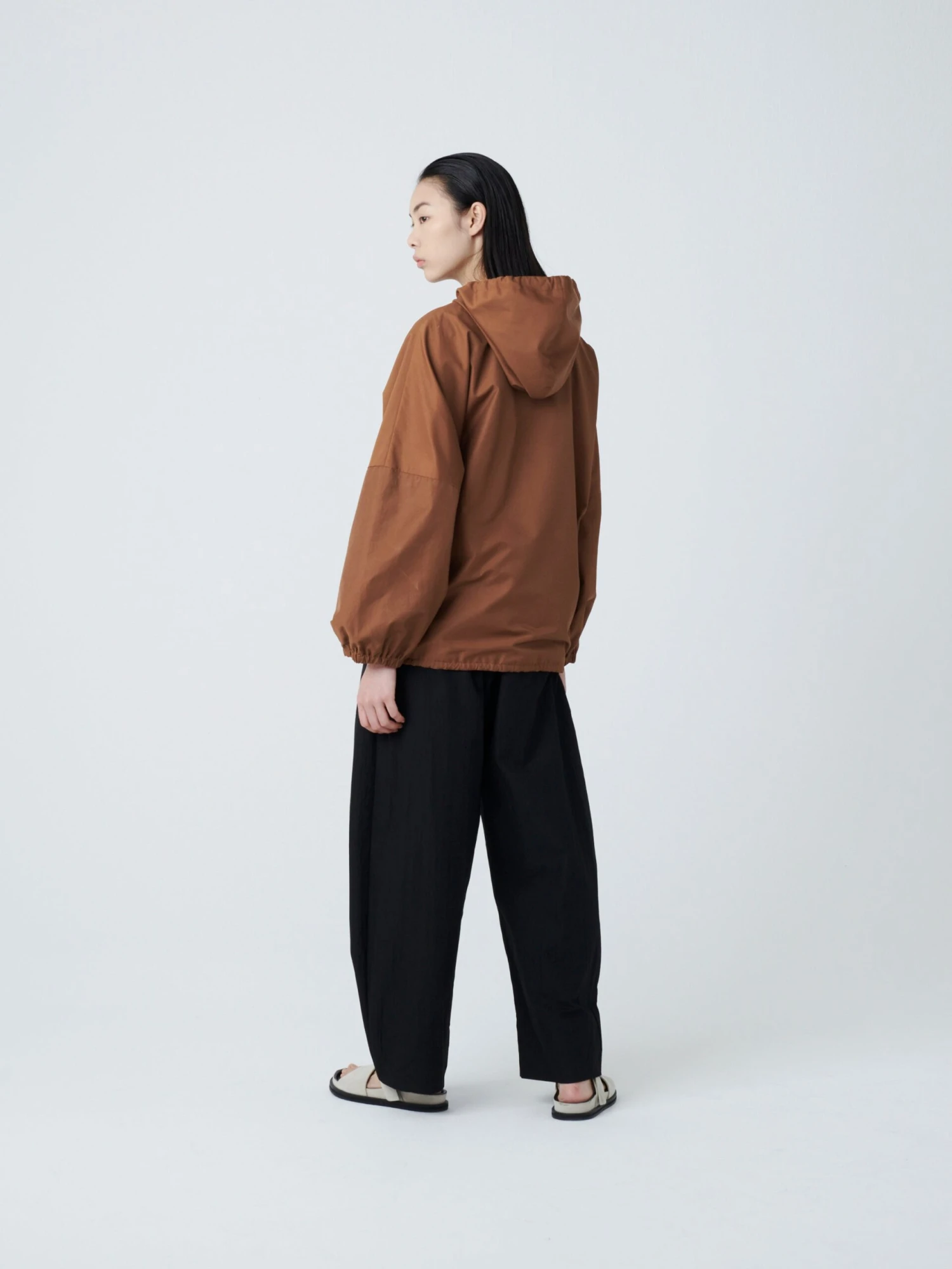 Oversized hooded jacket made from a water-repellent coated cotton.