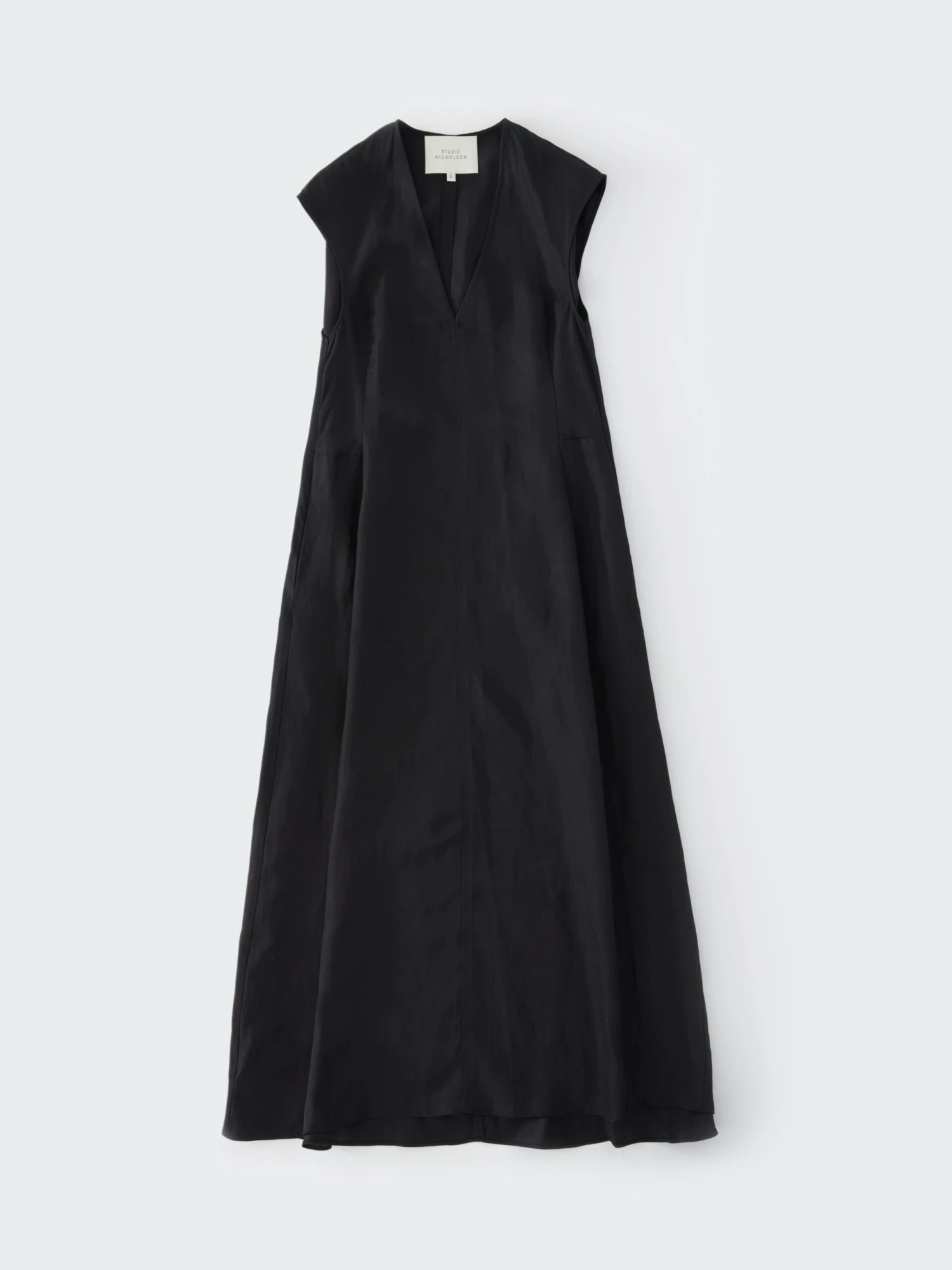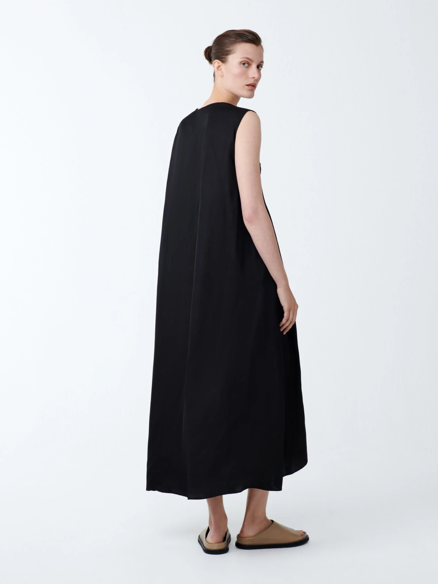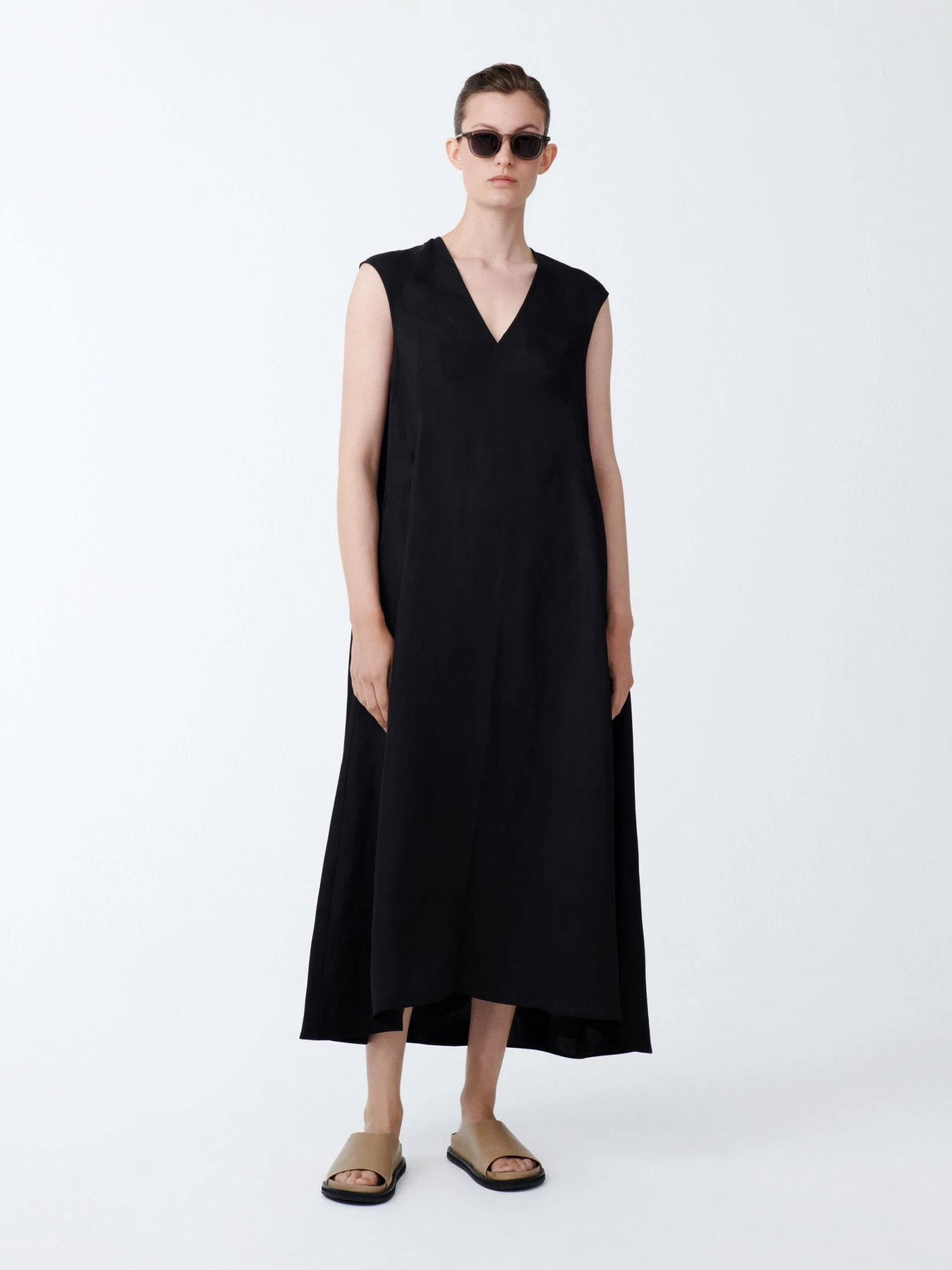 This sleeveless, full-length dress has an oversized fit for relaxed, effortless wear. It is made in a viscose-linen blend with a bouncy hand feel and slub texture with a natural crinkle. Style lines at the front give the dress a gentle structure, while the back is loose and billowy. Other details include a horizontal seam at the waist and side seam pockets.