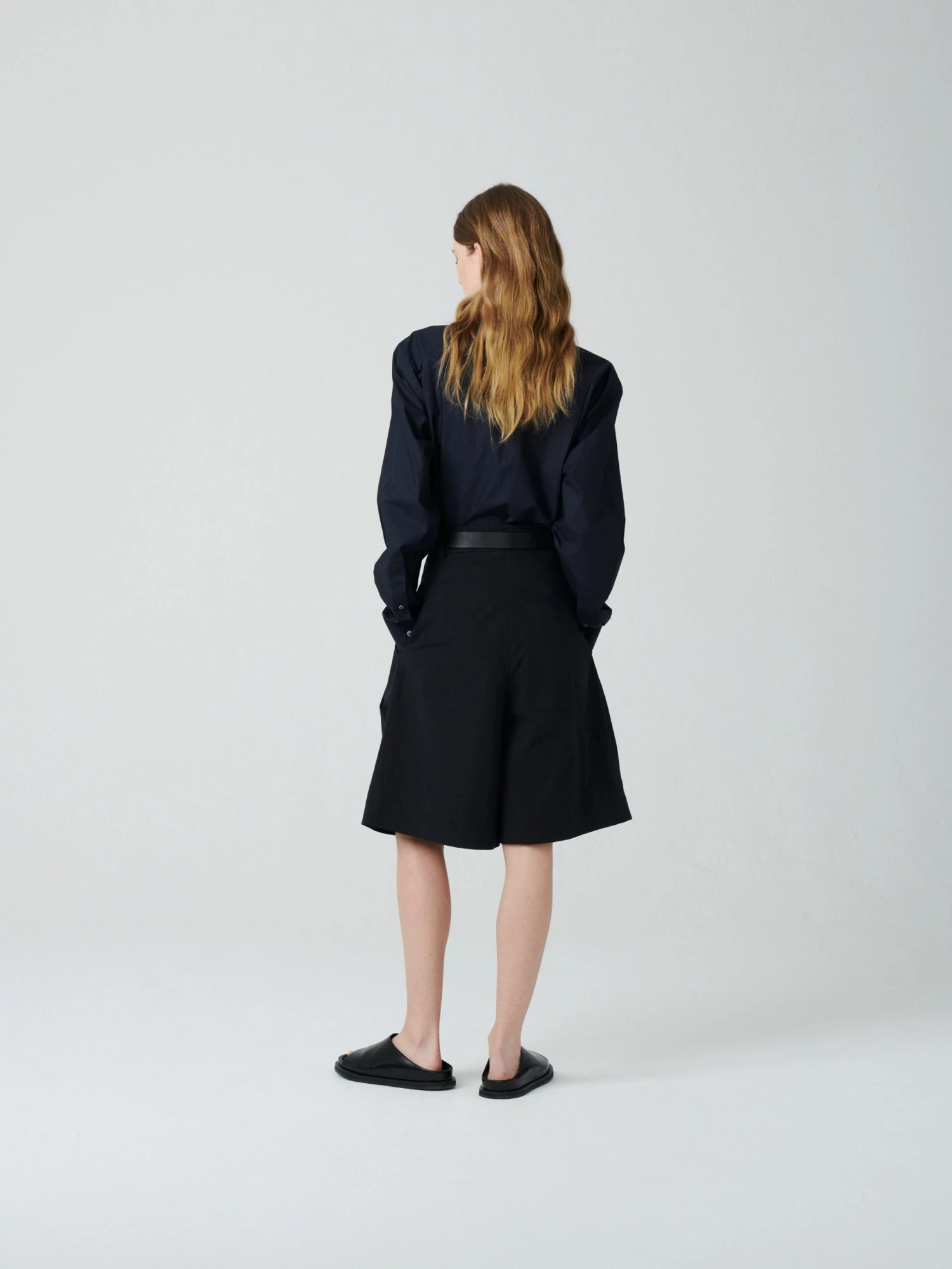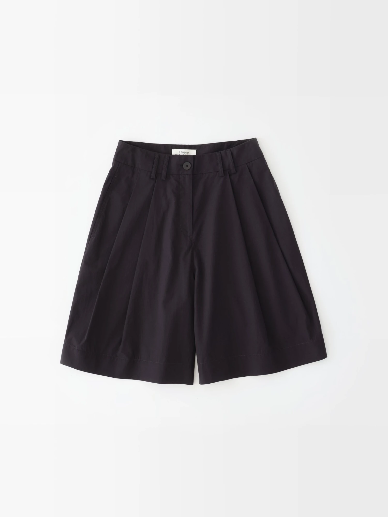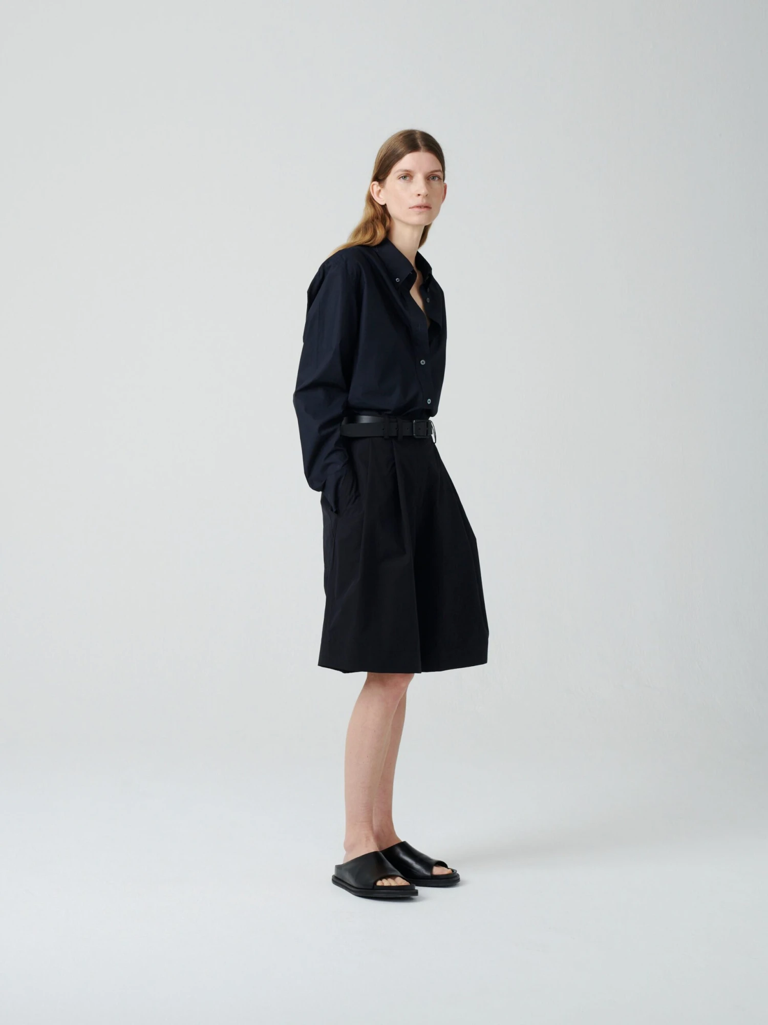 Above the knee length culotte style shorts made from our signature Italian powder cotton featuring deep double front pleats, two hand pockets at the side seam, one rear patch pocket and a deep hem.