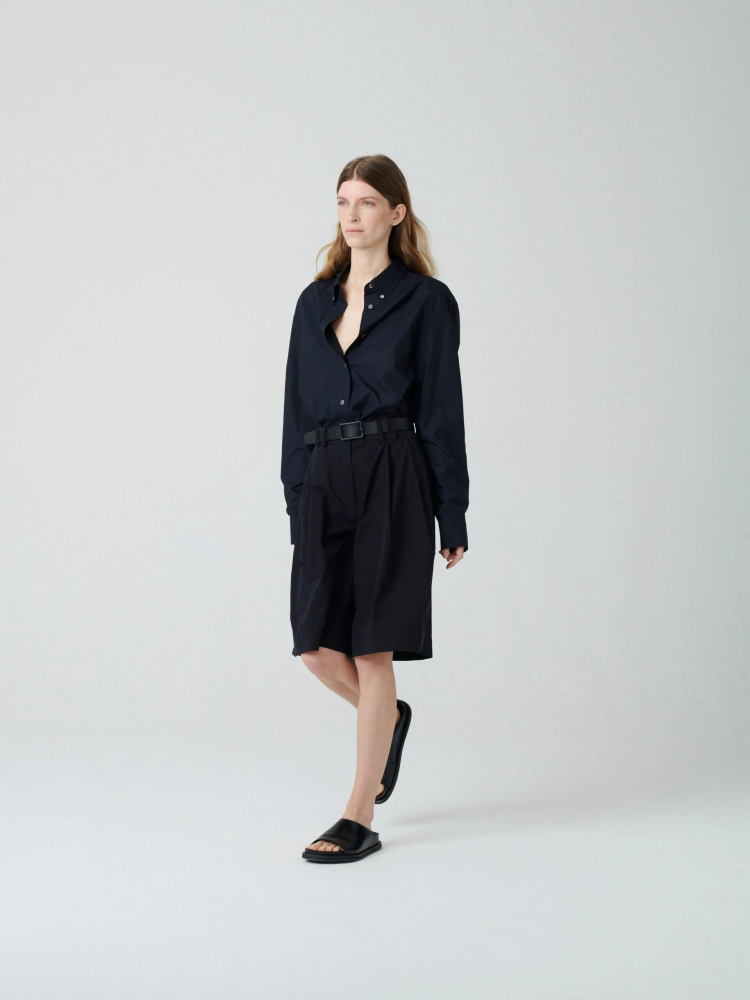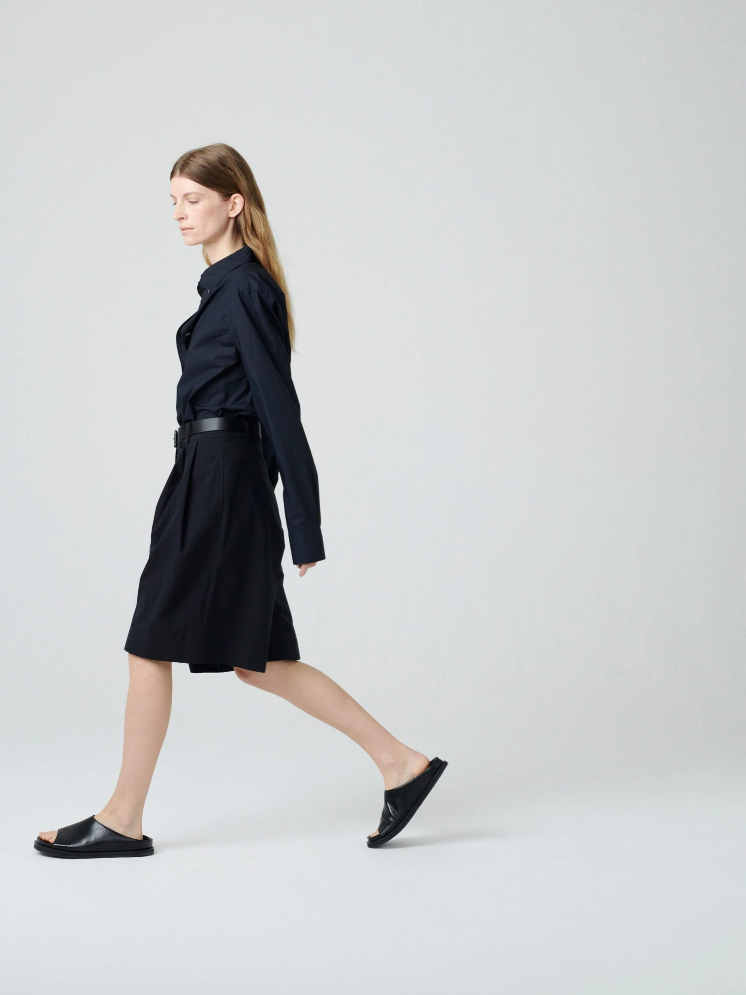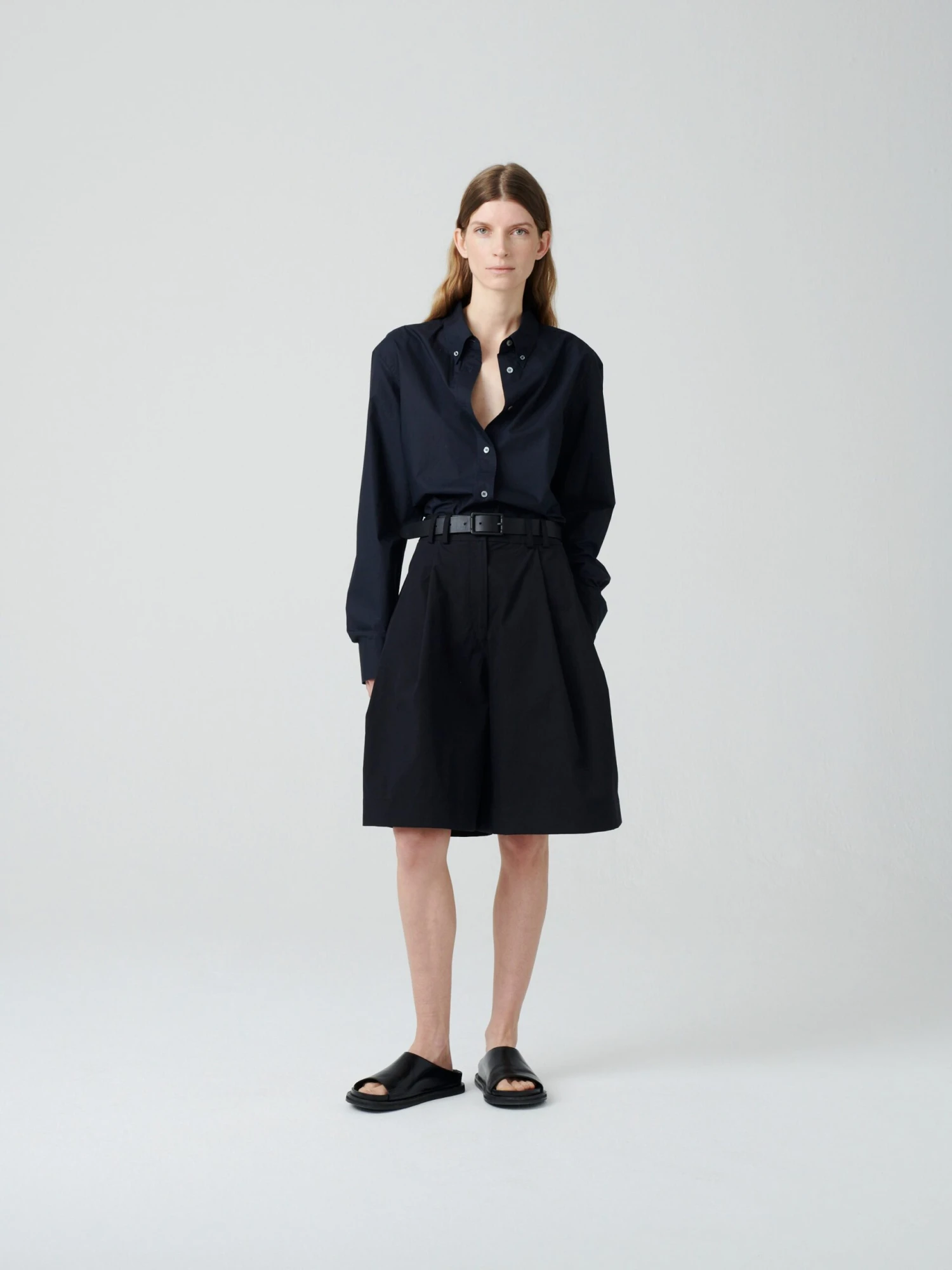 Above the knee length culotte style shorts made from our signature Italian powder cotton featuring deep double front pleats, two hand pockets at the side seam, one rear patch pocket and a deep hem.