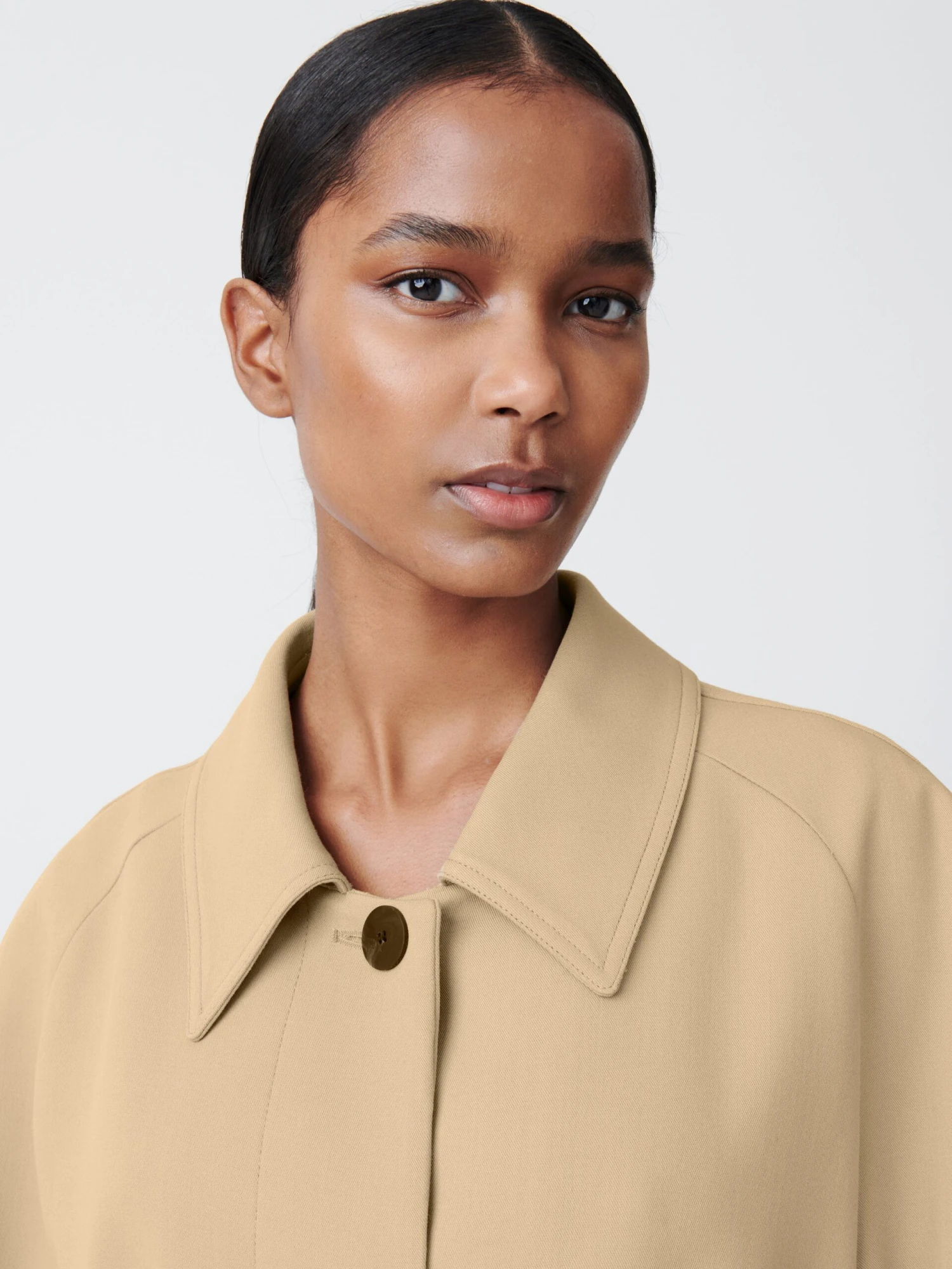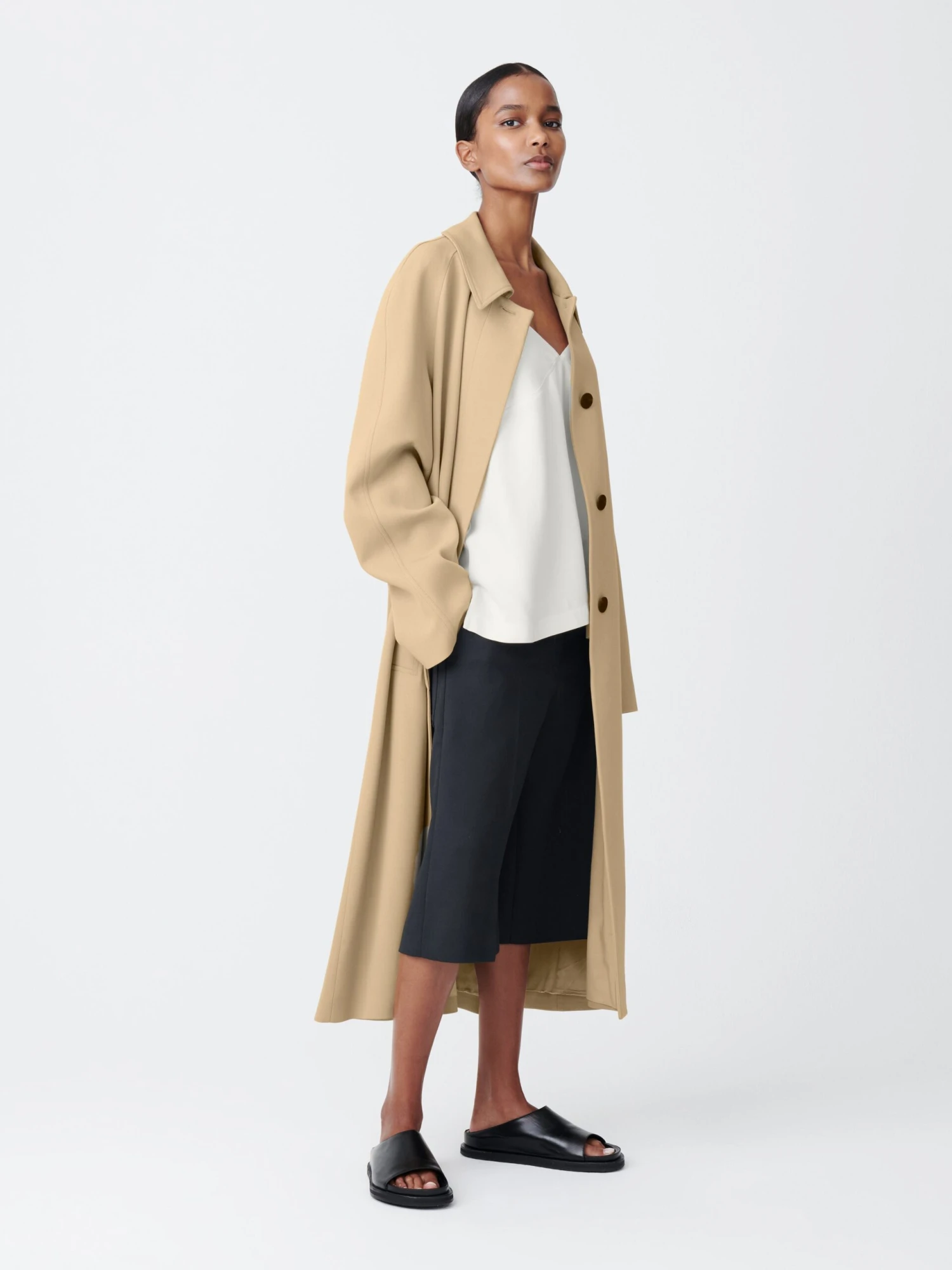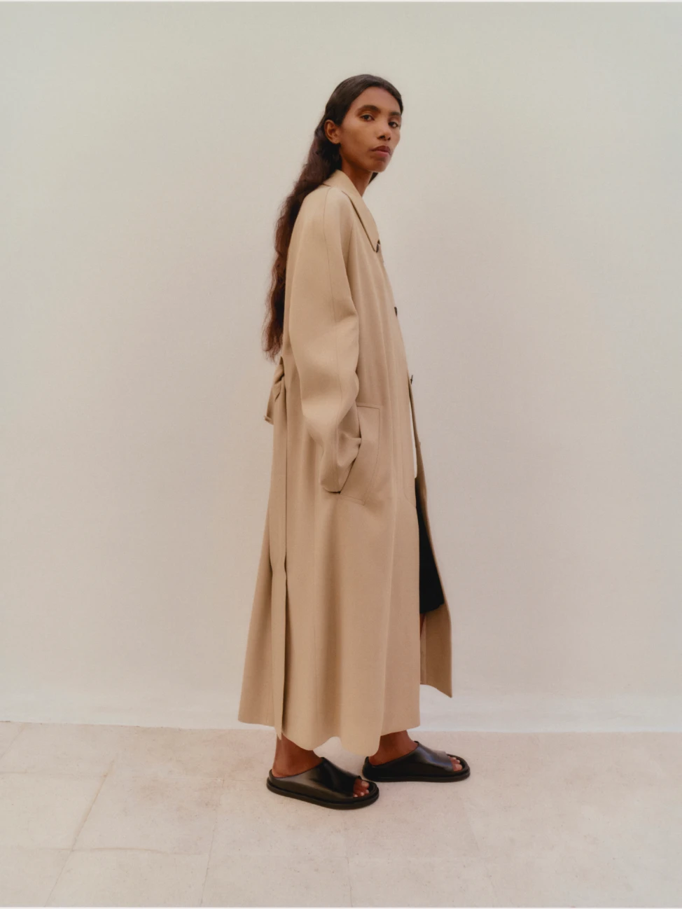 Reimagining the timeless trench coat in an elevated tailoring fabric, Denali is a highly sophisticated piece of outerwear. Its proportions are deliberately exaggerated, with a collar that sits away from the wearer’s neck.