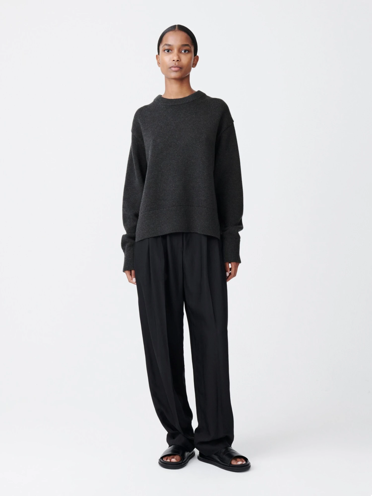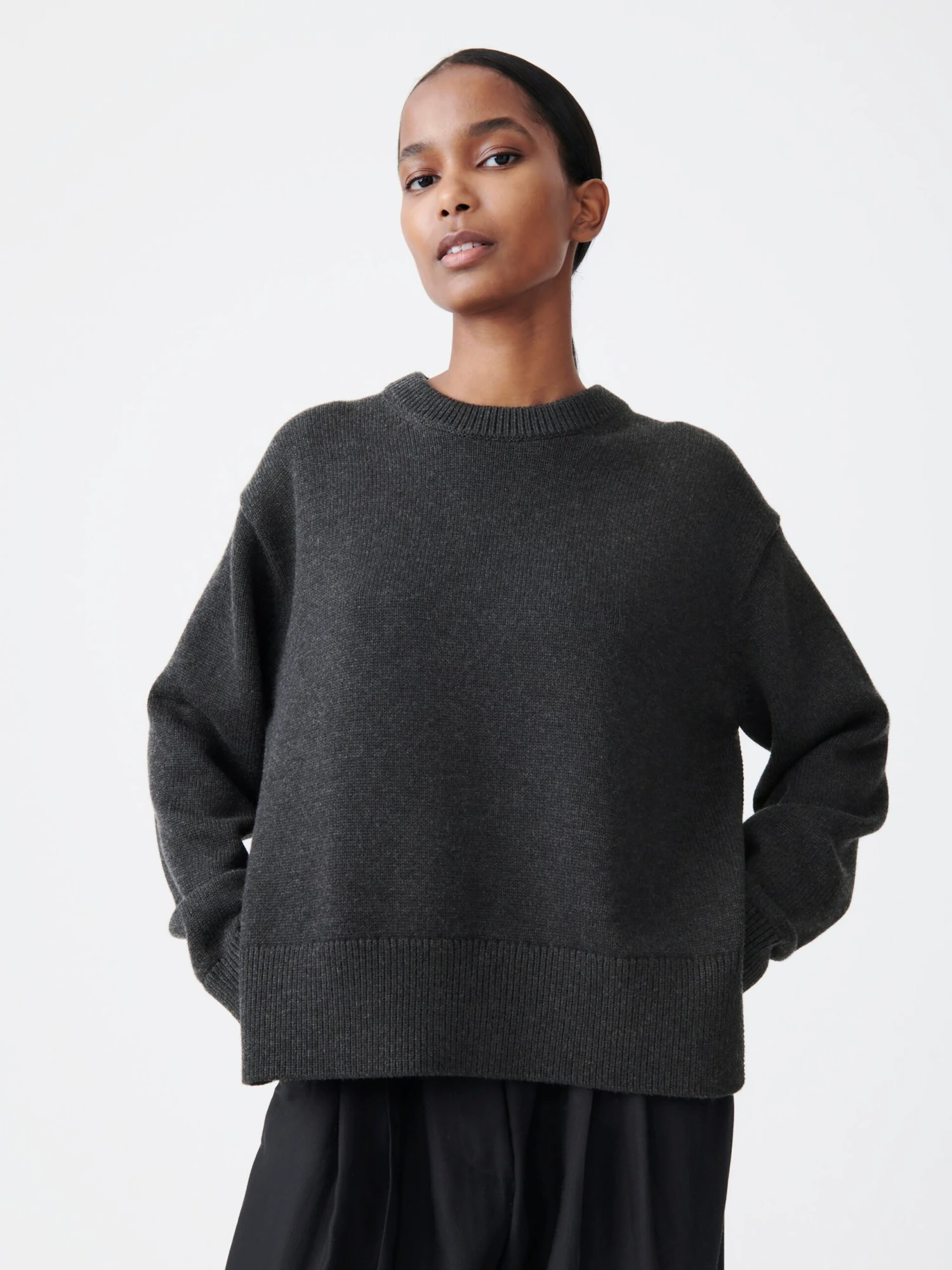 With its shorter length and side split hem, Hima has a deconstructed feel. It is knitted from a blend of merino wool and cotton, allowing it to sit somewhere between a jumper and a sweatshirt.