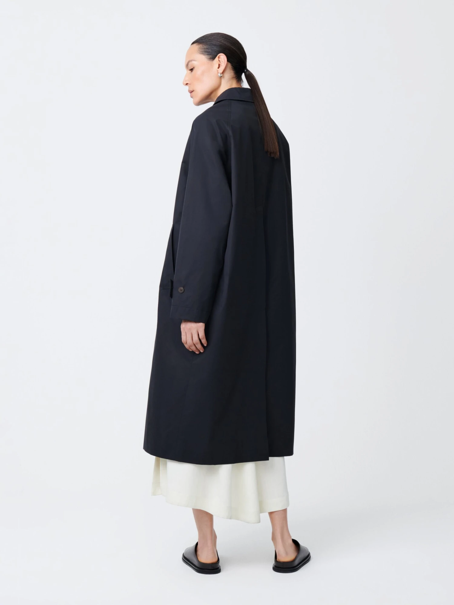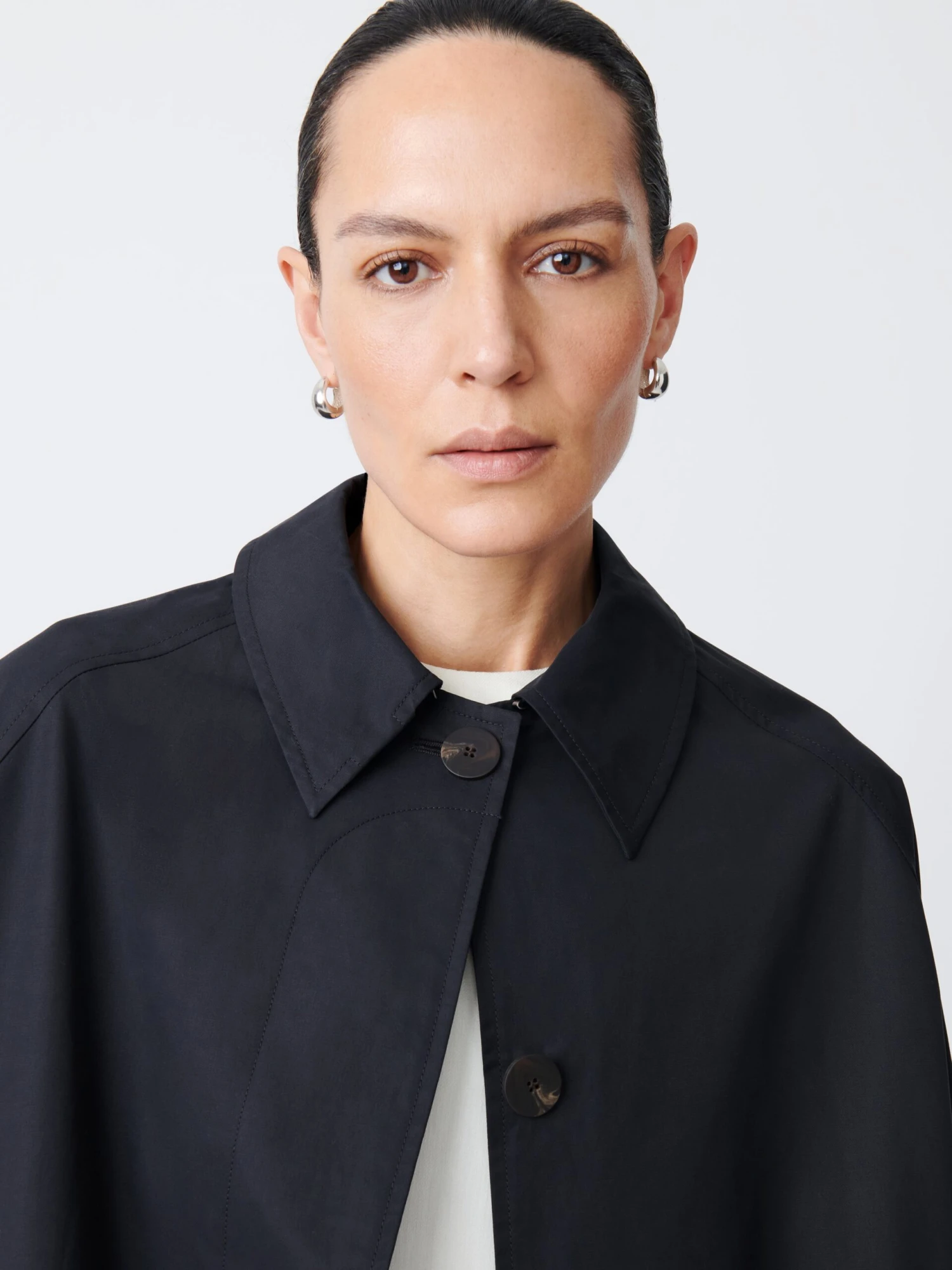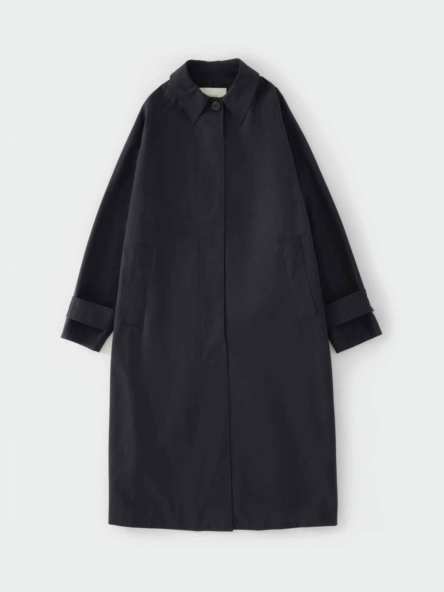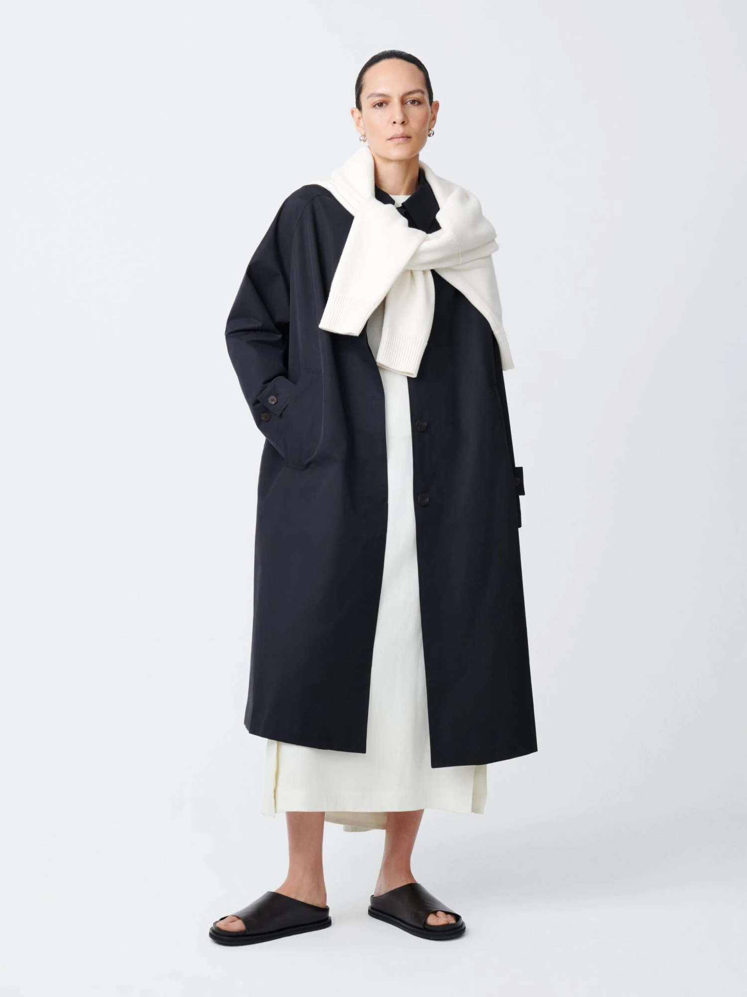 A loving tribute to classic trench coats, Holin’s raglan shoulder and full, voluminous cut make it sophisticated but easy to wear. The fabric is a crisp, performance-style cotton blend, with water repellent qualities.