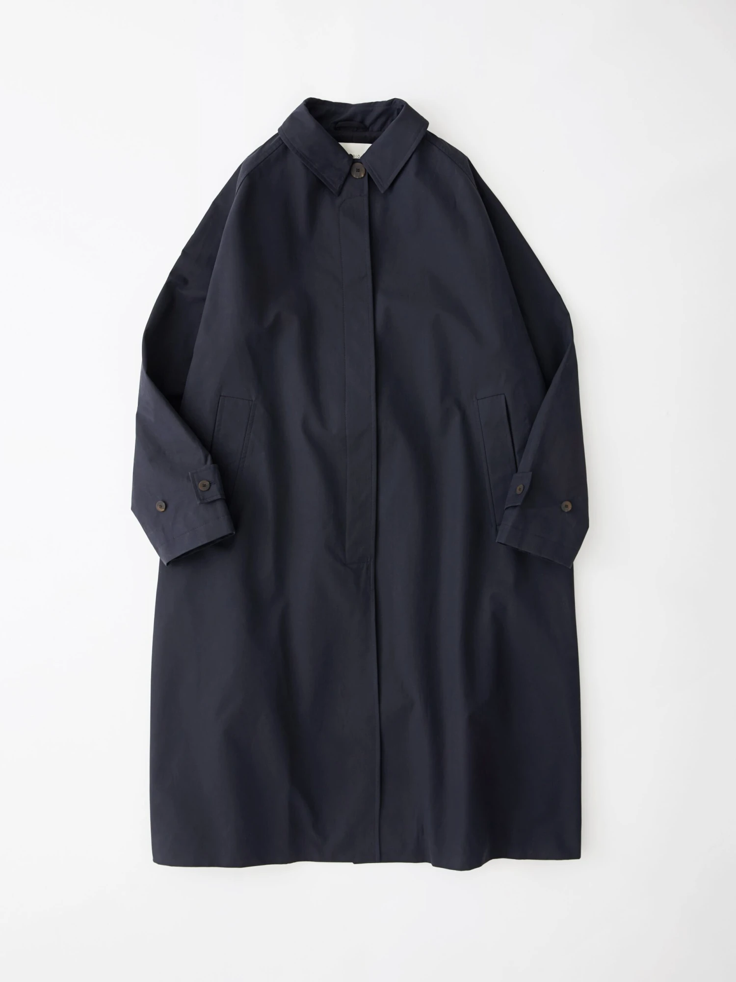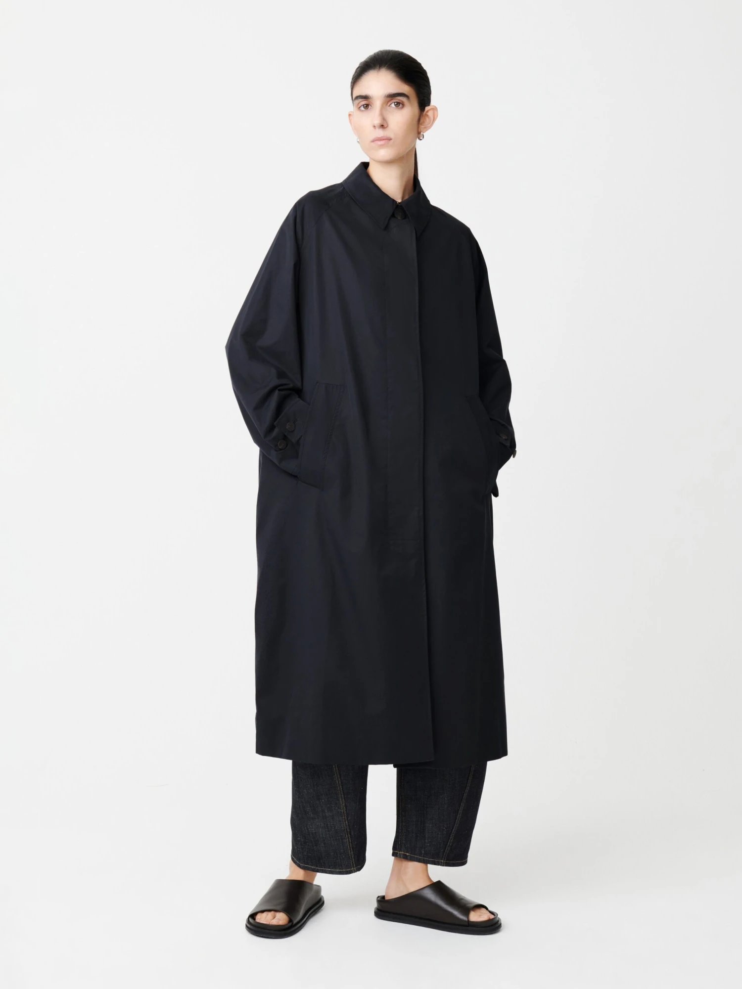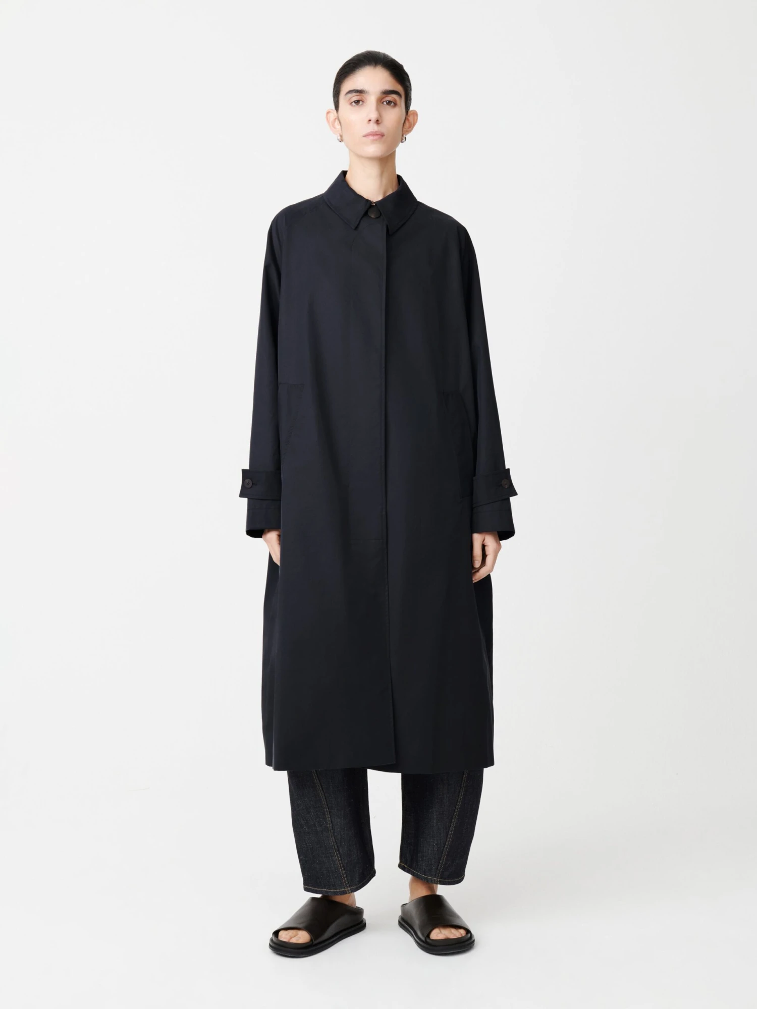 A loving tribute to classic trench coats, Holin’s raglan shoulder and full, voluminous cut make it sophisticated but easy to wear. The fabric is a crisp, performance-style cotton blend, with water repellent qualities.