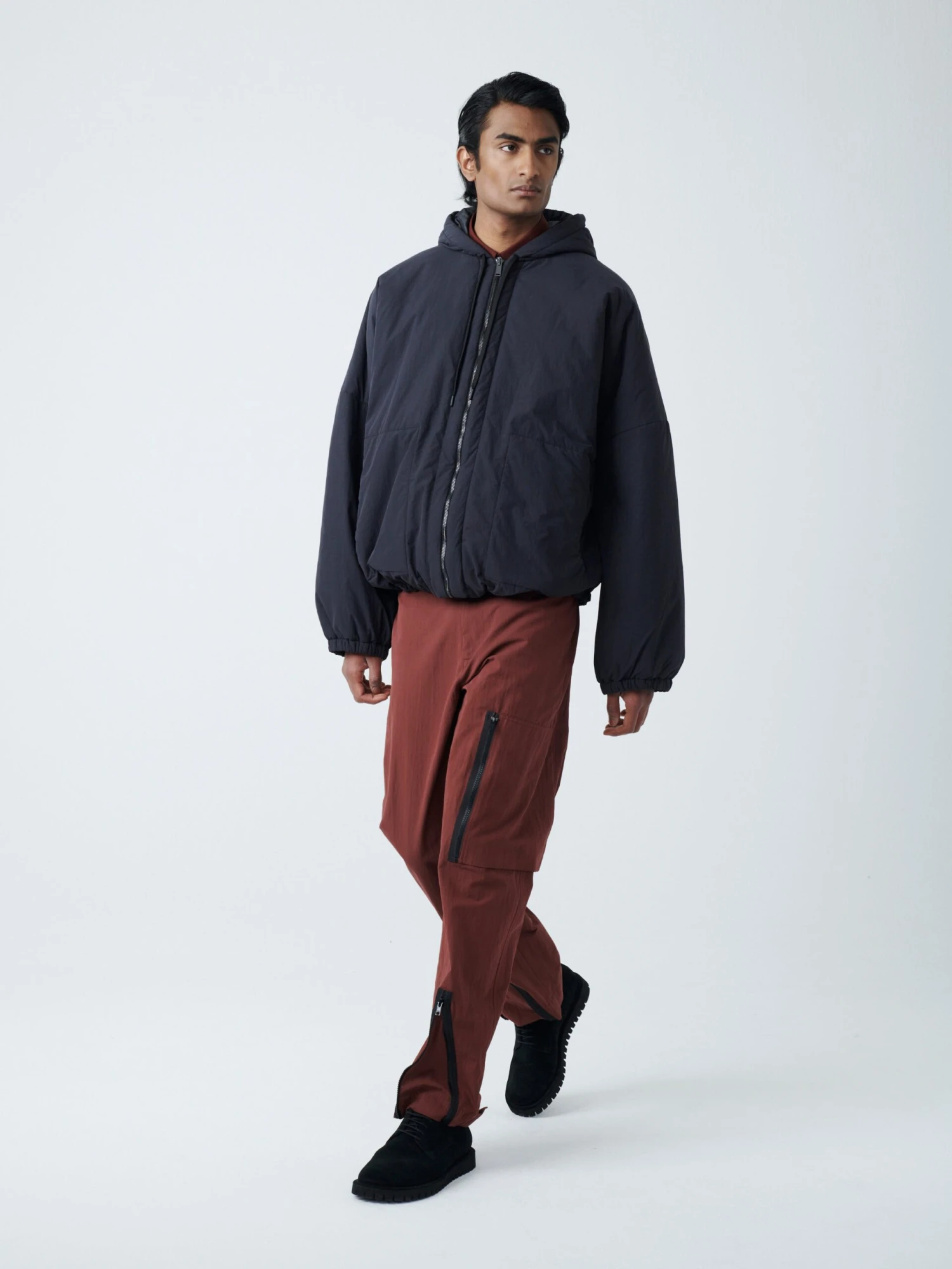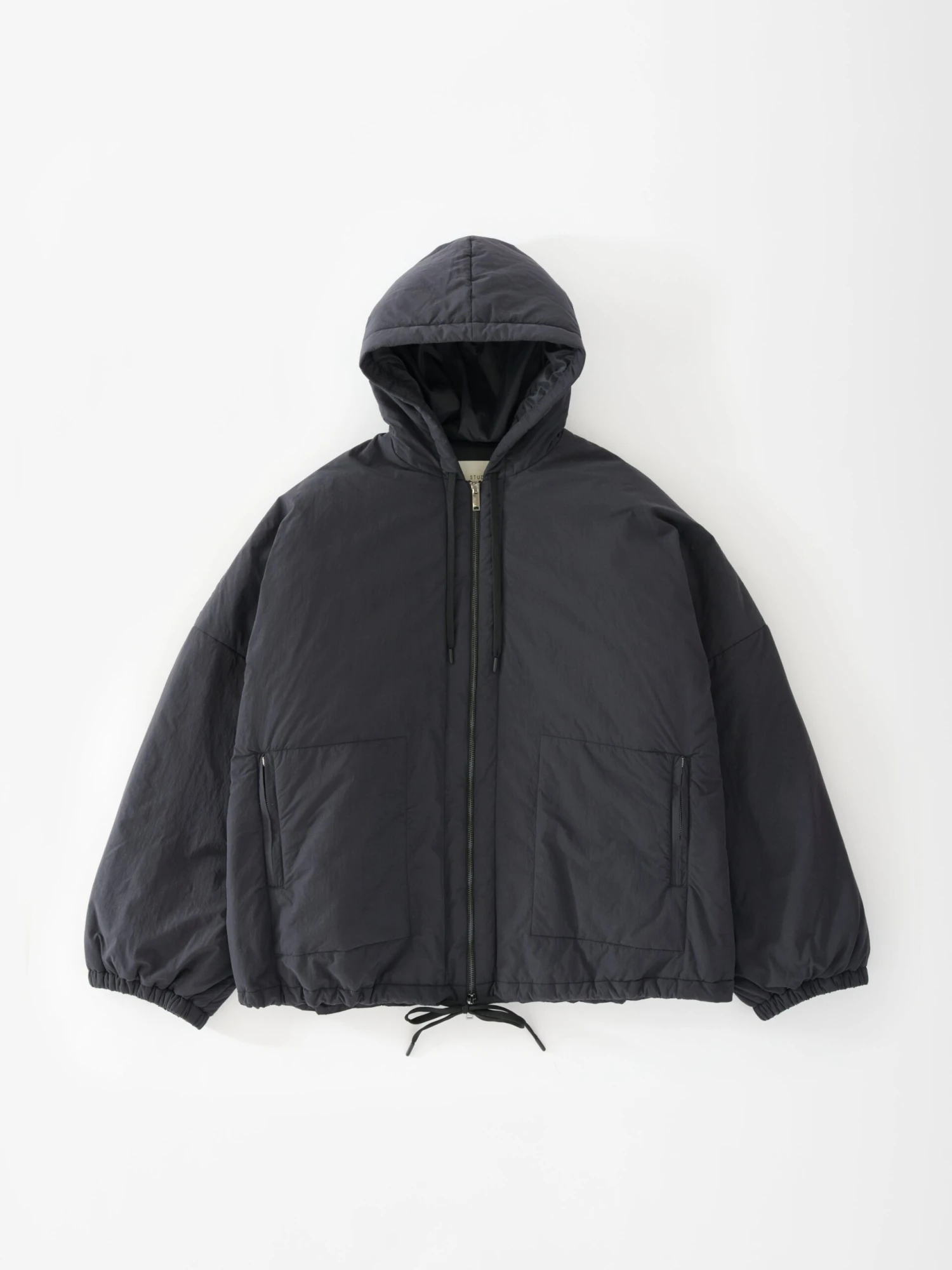 Oversized padded hooded jacket made from a water-repellent technical powder parachute outer and a recycled polyester injection ecodown.