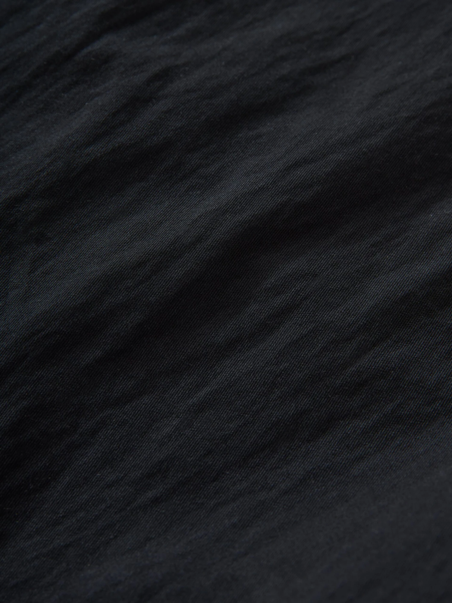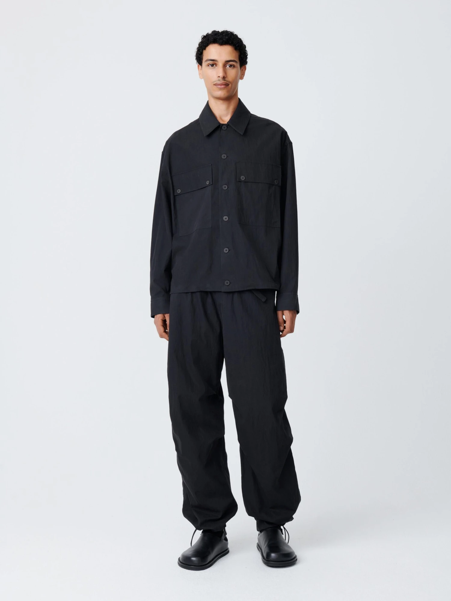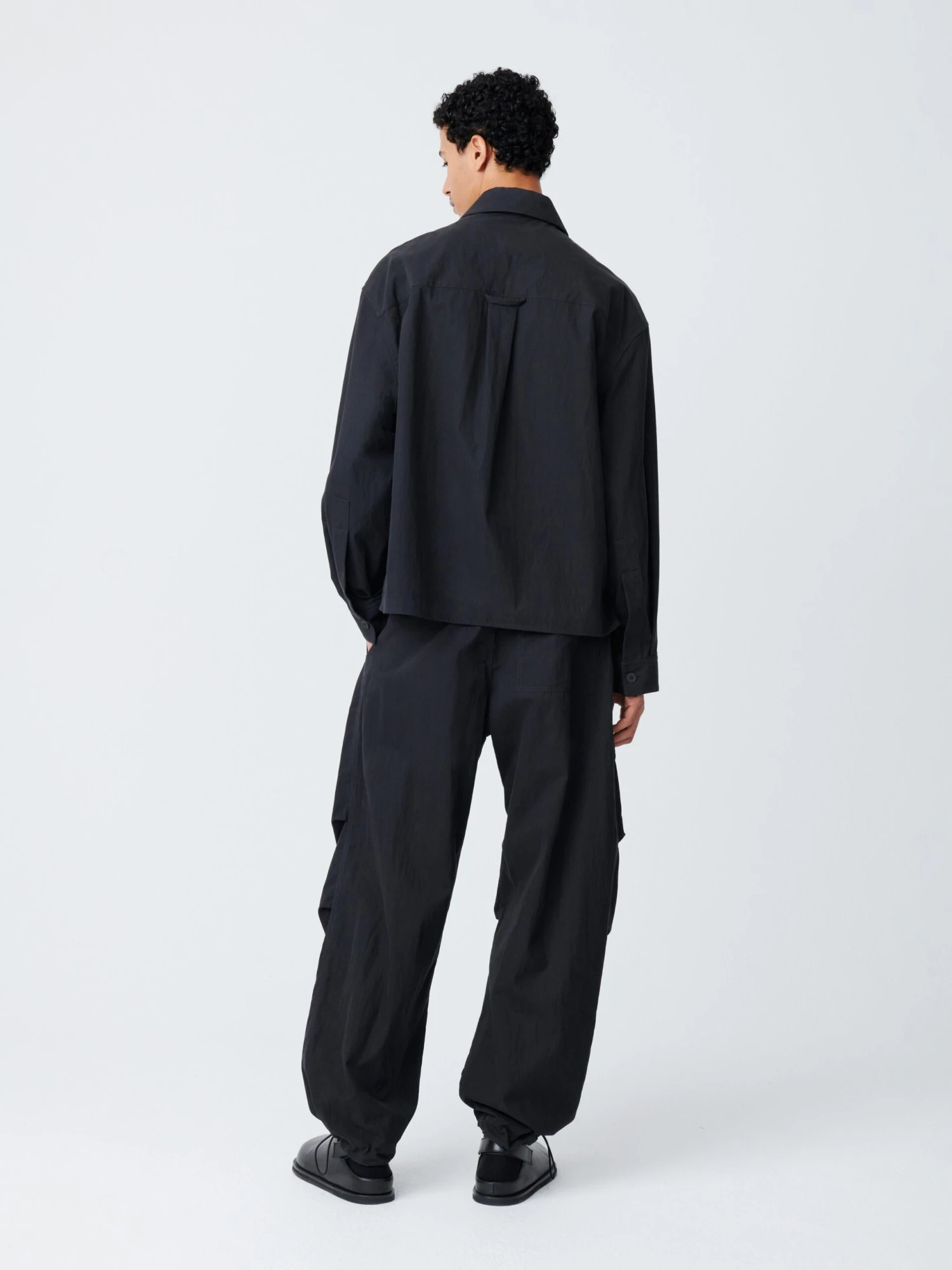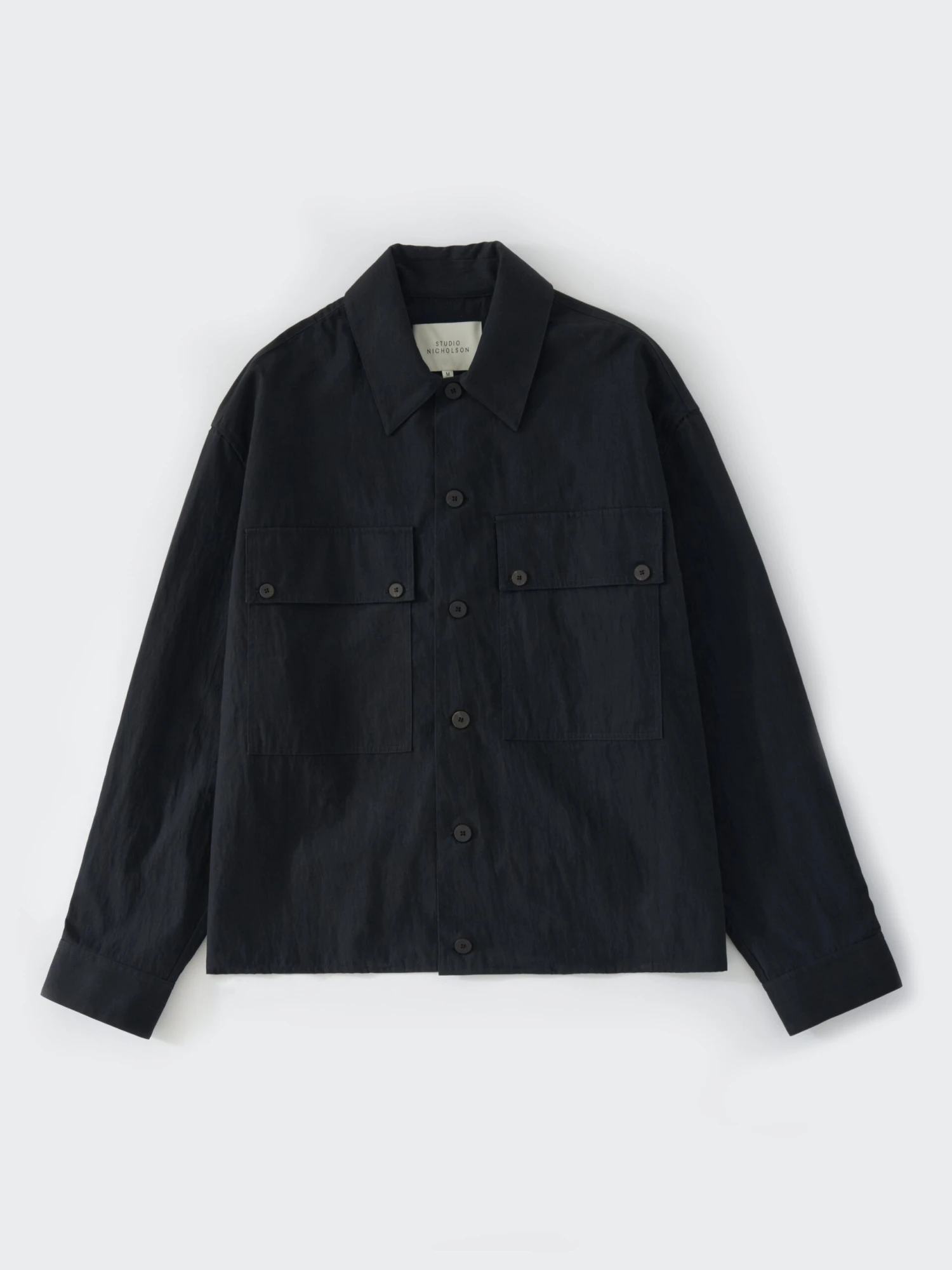 Iso’s design centres around two oversized patch pockets, each fastening with a twin-button military style flap. The cut is broad and boxy, with a slightly cropped length, sitting somewhere between a shirt and a utility jacket.