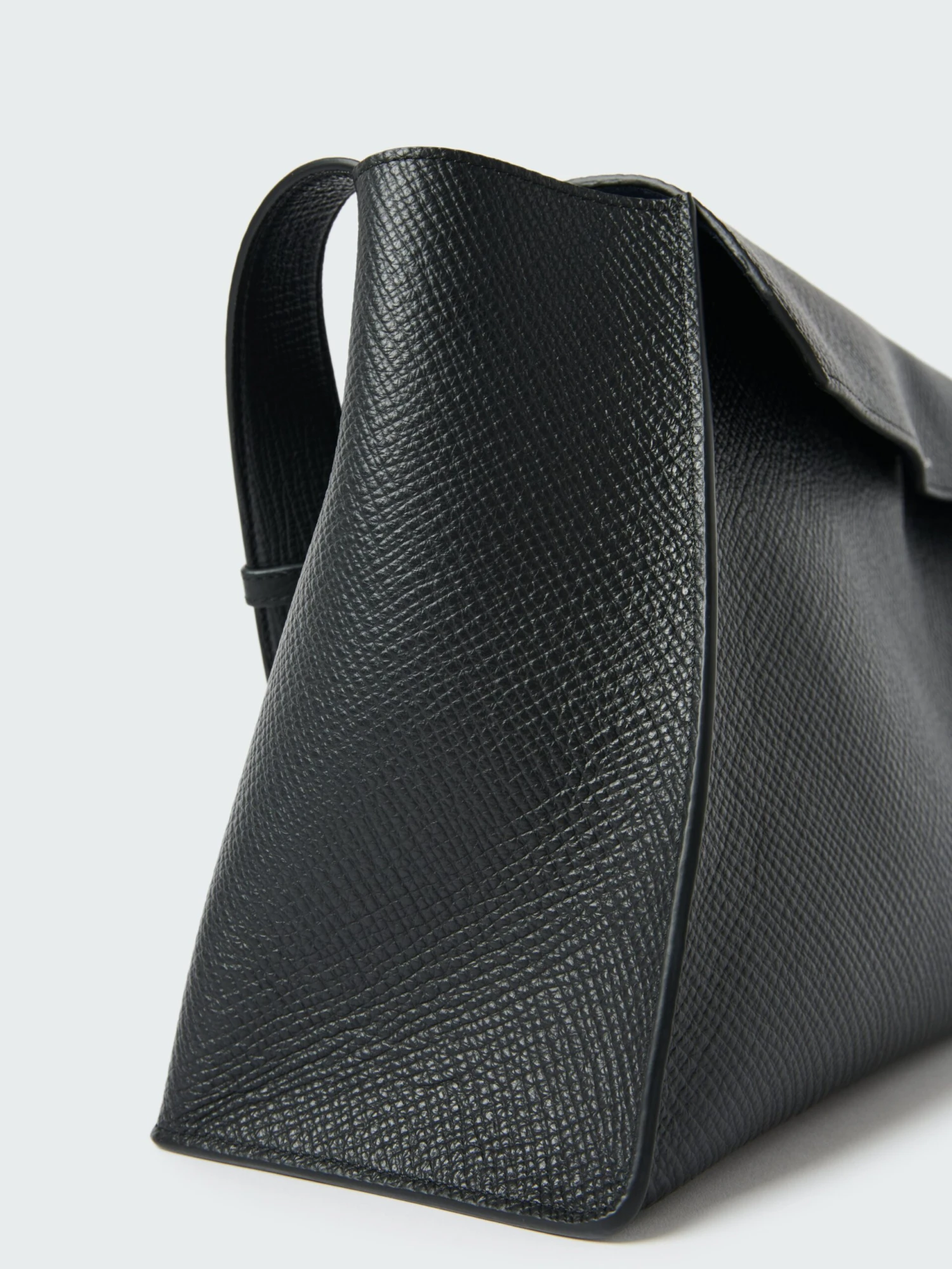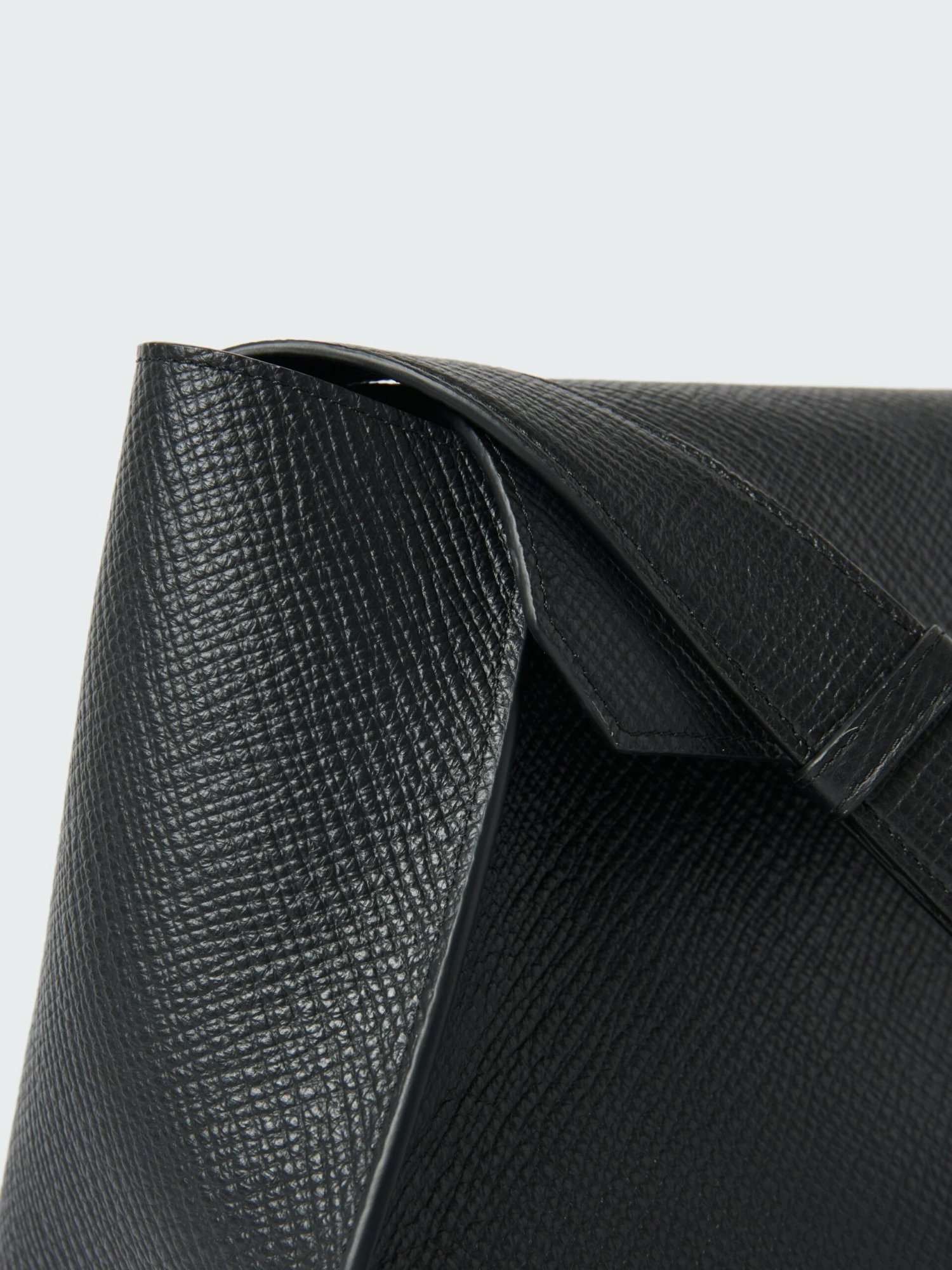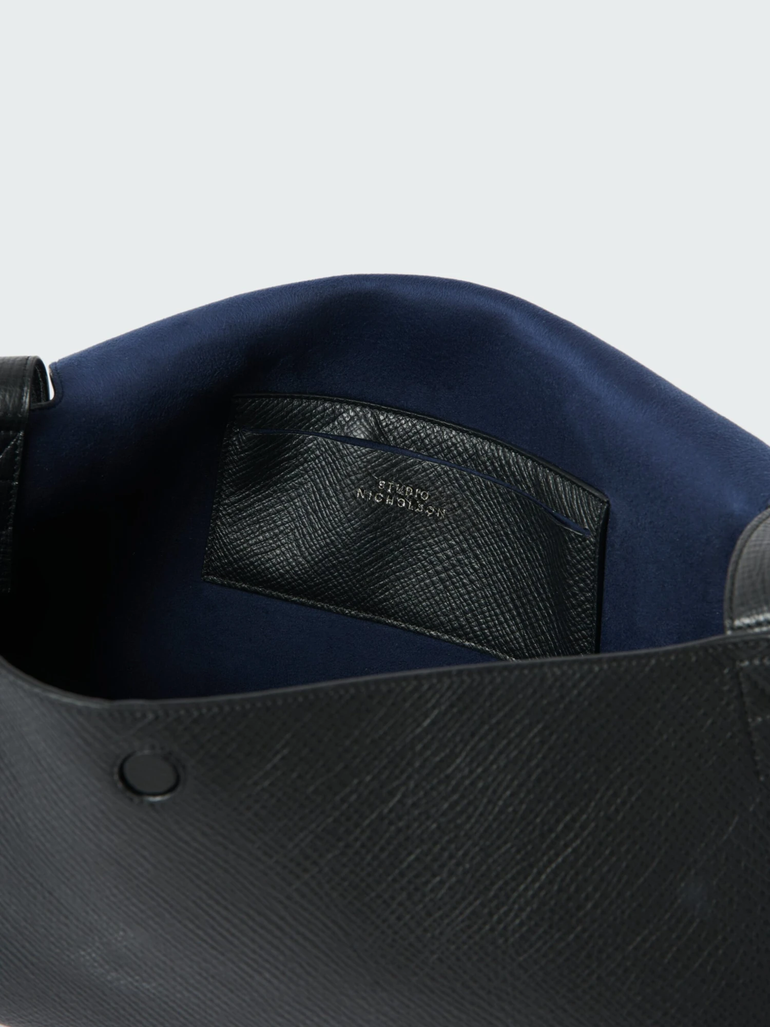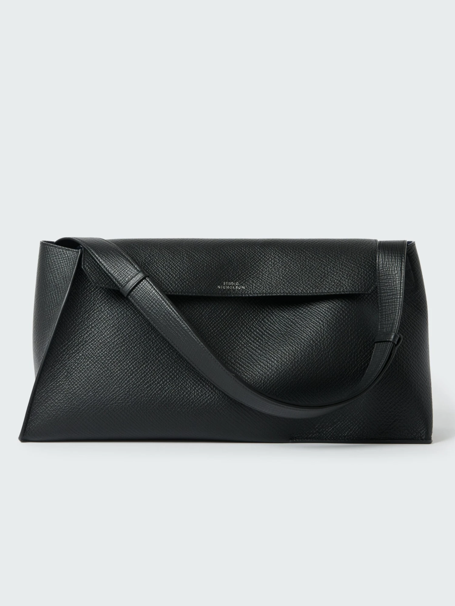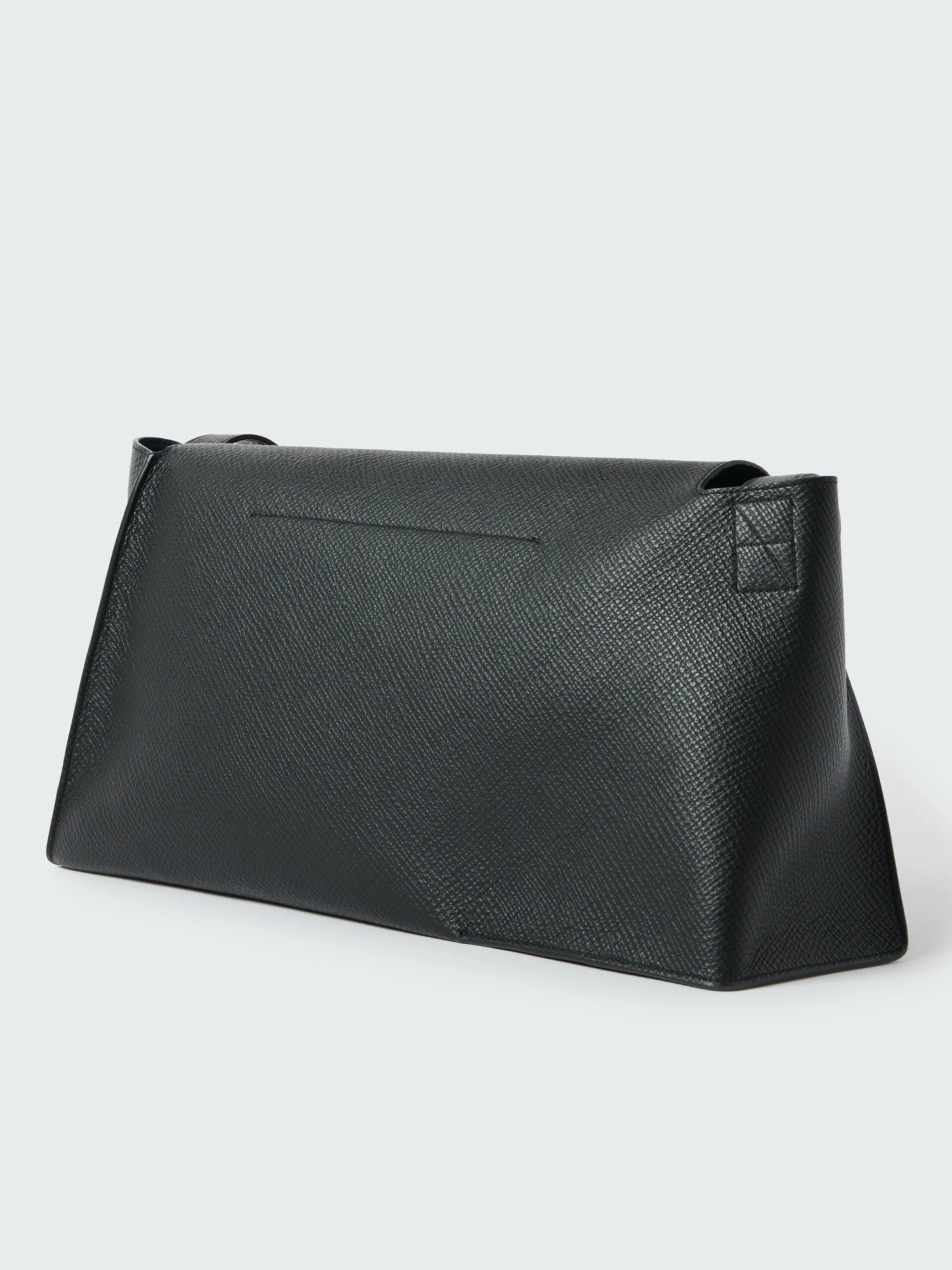 The Shiboru – meaning ‘to squeeze’ in Japanese – offers a relaxed take on a trapezium form. The construction combines perpendicular lines with the curved, permitting the bag to slouch when worn. Just two corners are fully seamed with a hand-painted edge whilst an adjustable shoulder strap is secured from the other opposing curved corners. The Shiboru’s folded concealed magnetic closure further allows the structure to determine its functionality.
