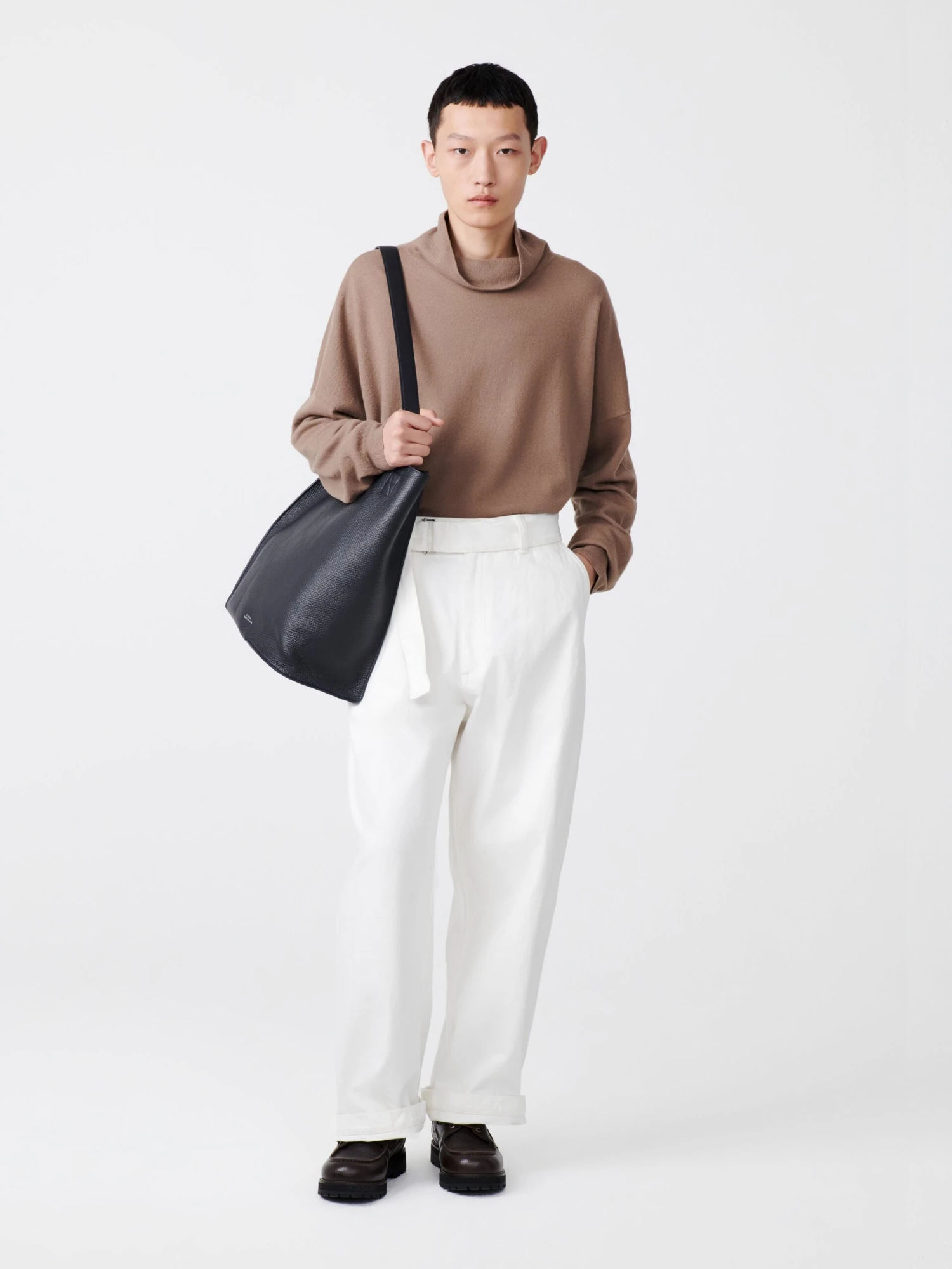 Our Tensa knit has a slouchy mock neck, a loose, boxy cut in the torso with drop shoulders, and long, slender sleeves. Beautifully crafted in a lightweight merino wool knit that has been lightly boiled for an extra soft, plush hand feel.