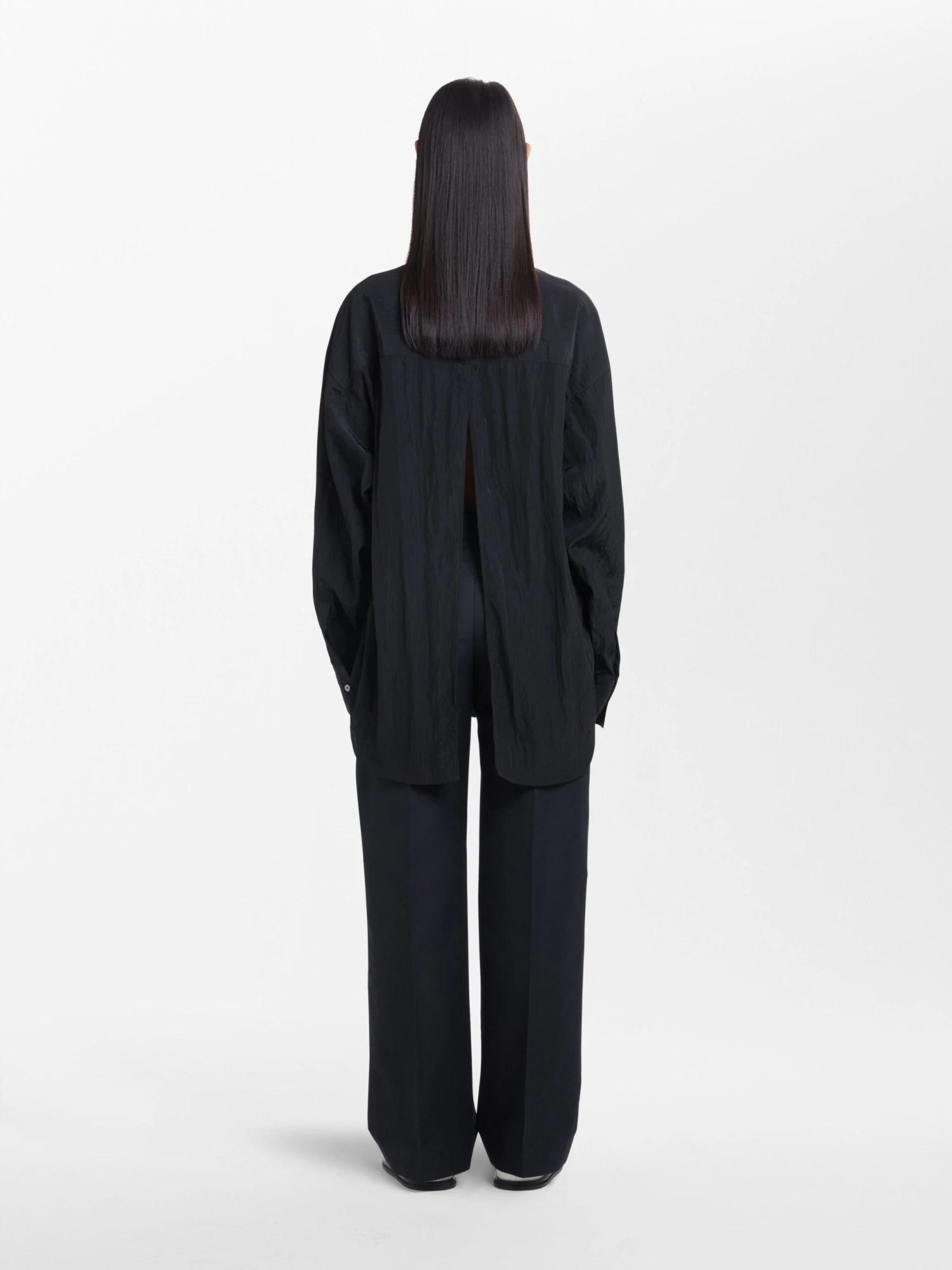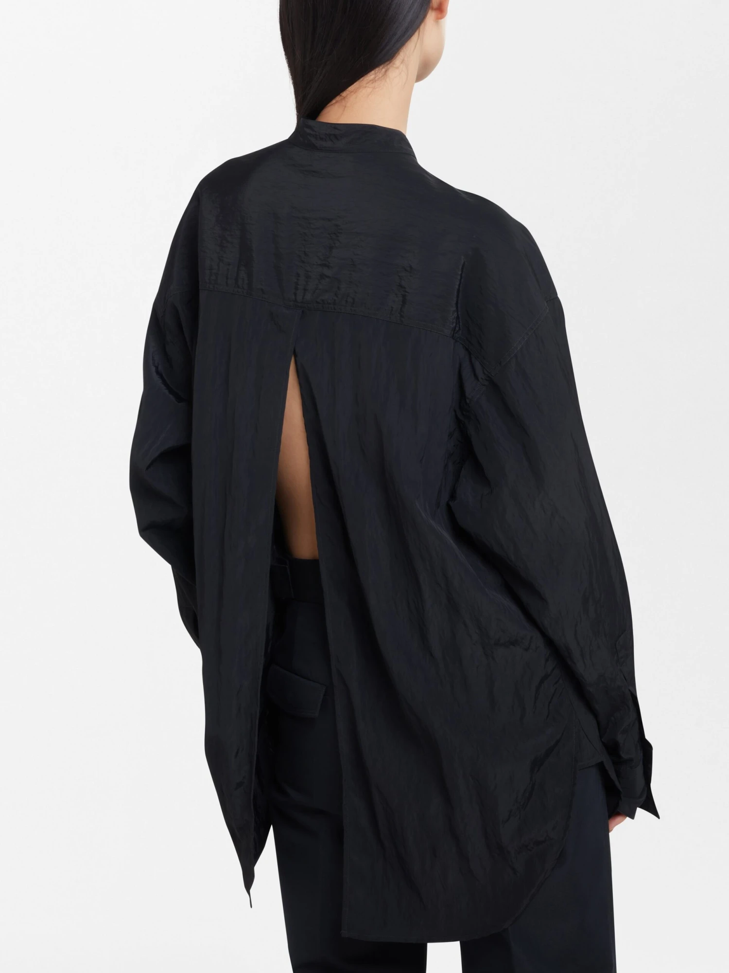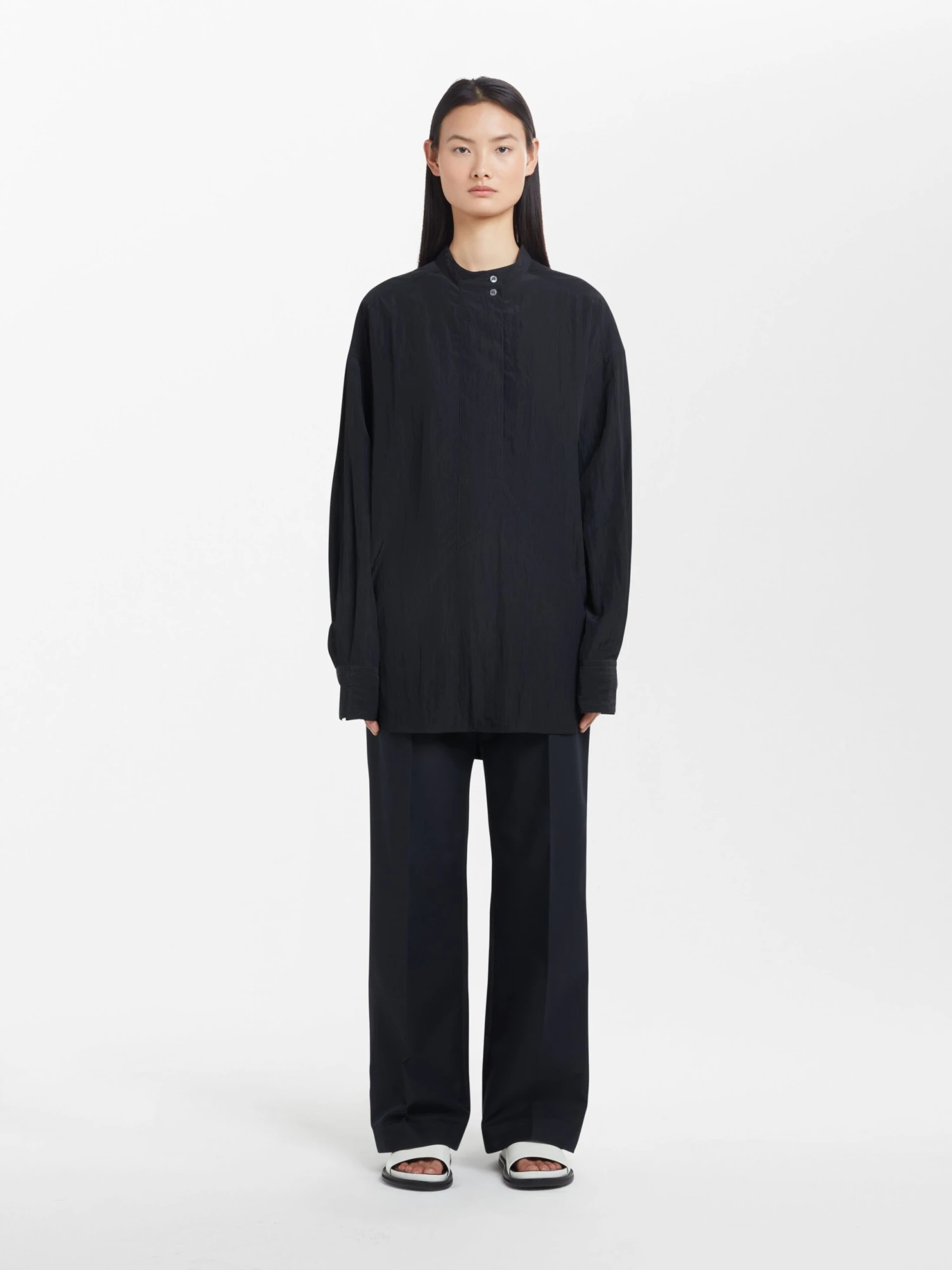Relaxed fitting pullover shirt made from a textured fluid viscose.